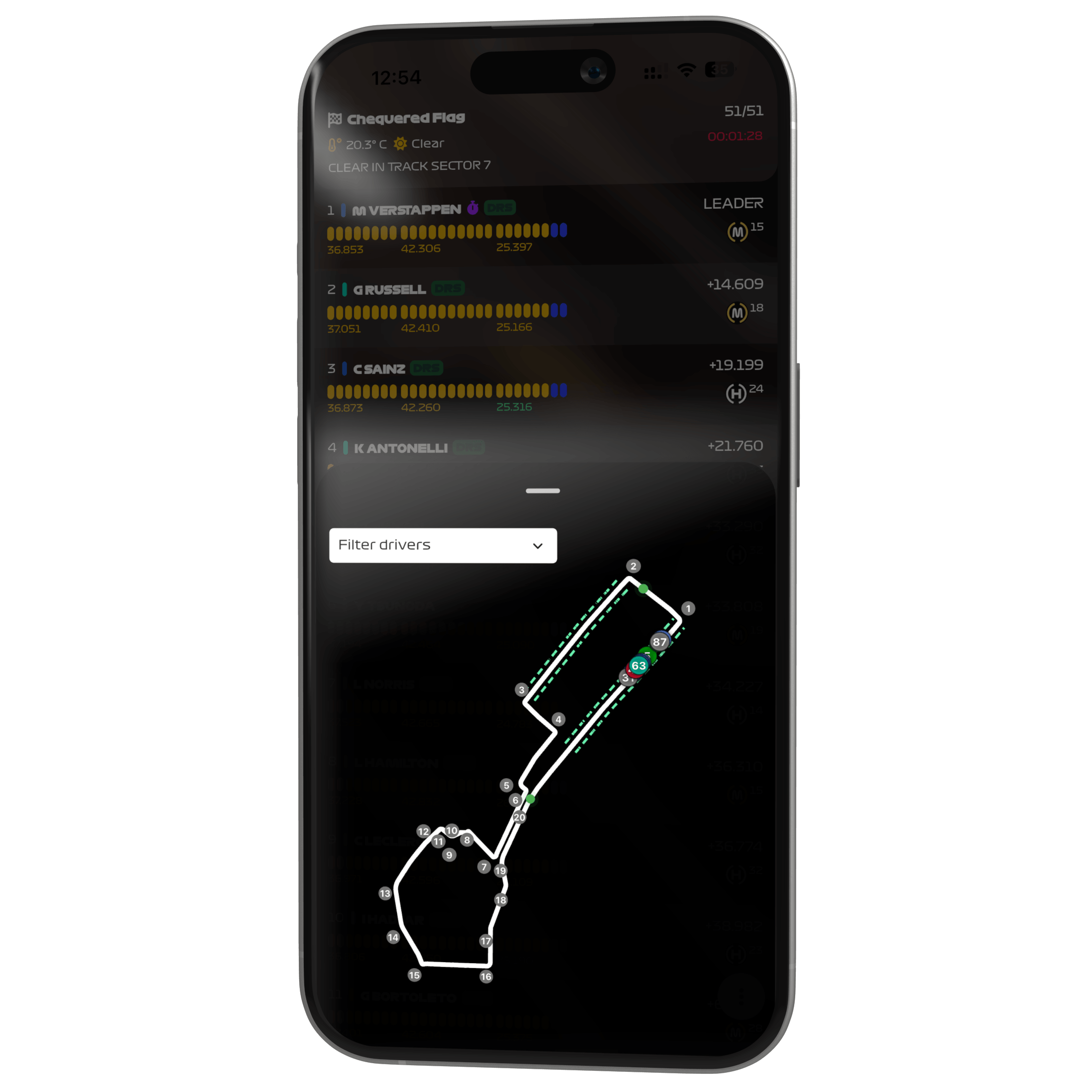 Experience Formula 1 like never before with the most advanced live map available. Follow every driver’s movement in real time and unlock a whole new way to see the race unfold.